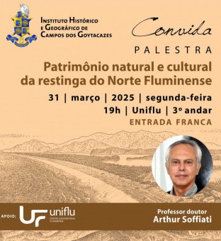 O Instituto Histórico e Geográfico de Campos dos Goytacazes abre nesta noite de segunda-feira (31) suas atividades de 2025. O professor, historiador, escritor e ambientalista Arthur Soffiati é o convidado da noite. O tema da palestra é "Patrimônio Natural e Cultural da Restinga do Norte Fluminense". O encontro será no 3º andar da Uniflu, às 19h, com entrada franca.