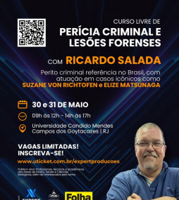 Nos dias 30 e 31 de maio, Campos dos Goytacazes será o cenário de um curso de destaque nacional: “Perícia Criminal e Lesões Forenses”, ministrado pelo perito Ricardo Salada. Conhecido por sua atuação em casos emblemáticos, como os de Suzane von Richtofen e Elize Matsunaga, Salada também é conhecido do público pela participação na série “Perícia Lab”, transmitida pelo canal AXN Brasil, e em podcasts sobre investigação criminal.