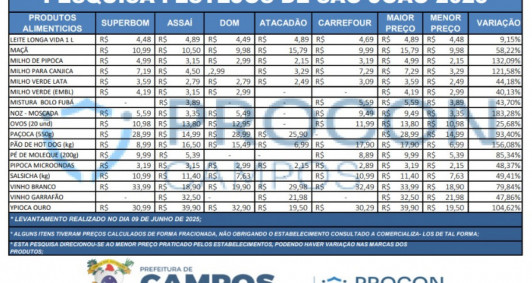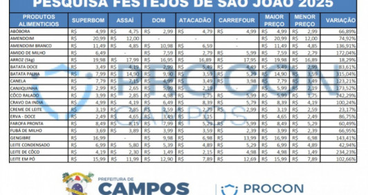 A Secretaria Municipal de Proteção e Defesa do Consumidor (Procon Campos) divulgou, nessa terça-feira (17), a pesquisa de preços dos itens típicos para a festa junina, realizada em cinco estabelecimentos da cidade. O levantamento, realizado no dia 9 de junho, contemplou 36 produtos, como leite de coco, creme de leite, paçoca, amendoim, leite condensado, erva-doce, milho de pipoca, pé de moleque, entre outros.