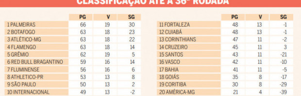 Com jogos neste sábado (2) e no domingo (3), a 37ª rodada pode definir o clube campeão. Se vencer o Fluminense no domingo, às 16h, em sua arena, o Palmeiras ficará com o título de forma antecipada em caso de tropeços de Galo (contra o São Paulo, às 21h deste sábado, no Mineirão), Fla (contra o Cuiabá, às 16h de domingo, no Maracanã) e Fogo (contra o Cruzeiro, às 18h30 de domingo, no estádio Nilton Santos). Mesmo que não assegure o troféu, o clube paulista ficará bem próximo dele se vencer, pois manterá a diferença para a última rodada e tem larga vantagem em relação aos concorrentes no saldo de gols.