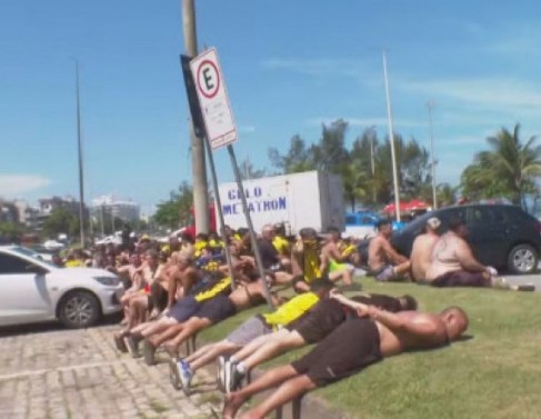 Entre 12h e 13h20, muitos torcedores escondendo o rosto, usaram paus e pedras para atacar os poucos policiais militares no local e até banhistas. PMs tentavam contê-los com bombas de efeito moral, em vão.