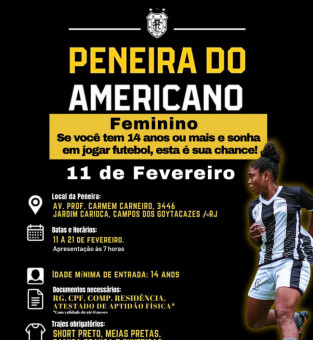 Em meio a peneira masculina do Americano, o clube anuncia a seletiva de meninas para o futebol campista. As inscrições já estão abertas e os testes começam dia 11 de fevereiro. Os interessados podem se inscrever até o dia 10 de fevereiro.