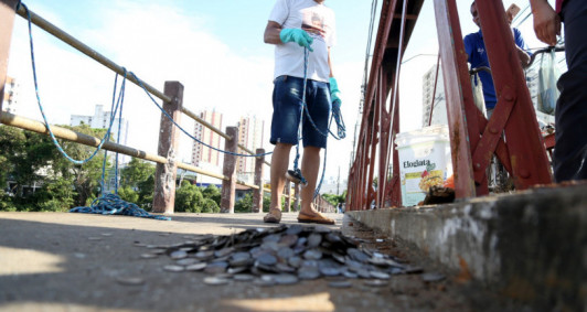 - Gosto da expectativa do que vou conseguir resgatar a cada jogada do ímã. As moedas estou guardando, já tenho até compradores, mas não quero vendê-las. Também já tirei uma bicicleta, facas e outras peças de metal; algumas deixo aqui para o pessoal do reciclável - destaca Niltinho que como todo pescador tem sempre uma história e brinca: "Isso aqui está sendo meu passatempo, meu momento de descanso. Se ficar em casa, minha mulher é igual ao Alexandre de Moraes (Ministro do Supremo Tribunal Federal ) tá sempre mandando fazer alguma coisa".