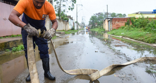 Na manhã desta segunda-feira (28), equipes da pasta realizaram bombeamento de acúmulo de água na Rua Projetada A, no Parque Novo Jóquei, onde há um projeto em licitação, junto ao Governo do Estado, para a realização do Programa Bairro Legal, que vai solucionar os problemas de alagamentos no local.