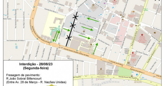 O Instituto Municipal de Trânsito e Transporte (IMTT) mantém a interdição da rua João Sobral Bittencourt, no trecho entre a avenida 28 de Março e a rua Nações Unidas, nesta terça-feira (29), das 8h às 17h, para continuidade do serviço de fresagem. O cronograma das obras do Programa Asfalto Novo foi alterado em função do mau tempo.