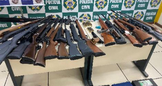 No interior da residência, foram apreendidos um revólver, uma espingarda com luneta, 108 munições, 25 estojos deflagrados e um carregador vazio de rifle, além de uma pistola e seis carabinas de ar comprimido.