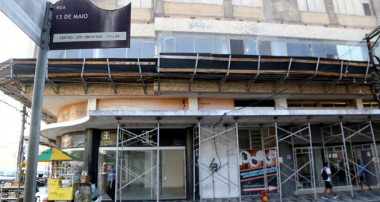 Com escoramento - O prédio com mais de 30 anos, inacabado na rua 13 de Maio, na área do Centro antigo, é outra estrutura que chama atenção e recebeu escoramento metálico mais recente. No passado, a parte térrea já foi o endereço do antigo Banco do Labrador e da antiga Companhia de Eletricidade do Rio de Janeiro (Cerj) e, atualmente, ainda tem comércio em funcionamento. “Esse prédio pela condição já preocupou. Agora, recebeu escoramento e tela de proteção. As pessoas passam tranquilamente por baixo do escoramento, sem nenhum temor. Acho que se tivesse perigo a Defesa Civil já teria determinado alguma medida”, disse um comerciante do entorno.