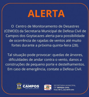 O Centro de Monitoramento de Desastres (Cemod) da secretaria de Defesa Civil de Campos emitiu alerta para possibilidade de ocorrência de rajadas de ventos até muito fortes nesta quinta-feira (28). Tal situação pode provocar quedas de árvores, dificuldades de andar contra o vento, danos a construções de pequeno porte e destelhamentos. Em caso de emergência, contate a Defesa Civil pelos telefones 199 e (22) 98175-2512.