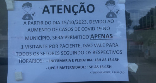 O cartaz informa que "devido ao aumento de casos de Covid-19 no município, será permitido apenas um visitante por paciente, isso vale para todos os setores". A unidade tem alas de enfermaria, pediatria, UPG e maternidade. No sábado (14), segundo uma moradora da cidade, não foi permitida nenhuma visita aos pacientes internados.