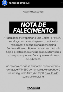 Andressa cursava medicina na Faculdade Metropolitana São Carlos (Famesc), em Bom Jesus. A instituição publicou nas redes sociais uma nota sobre o falecimento da estudante. “A Famesc recebe, com profundo pesar, a notícia do falecimento de sua aluna de medicina Andressa Barreto Ribeiro, ocorrido na data de hoje, e presta condolências aos seus familiares e amigos, rogando a Deus que a receba em seus braços. Ao tempo em que se solidariza com a família e amigos, a Famesc comunica que suspenderá nesta segunda-feira, dia 30/10, as aulas do curso de Medicina”, informa a nota.