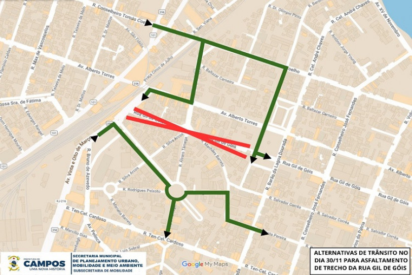 Dando seguimento às obras do Programa Asfalto Novo, a Prefeitura de Campos, por meio do Instituto Municipal de Trânsito e Transporte (IMTT), irá interditar, nesta quinta-feira (29), a rua Gil de Góis, no trecho entre a avenida 28 de Março e a rua Baronesa da Lagoa Dourada, para execução do serviço de aplicação de massa asfáltica.