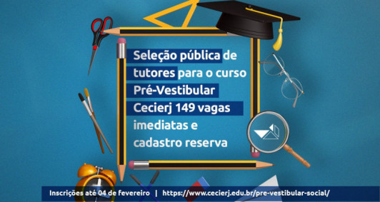As inscrições devem ser realizadas até o dia 4 de fevereiro de 2024, mediante o pagamento da taxa de R$40, exclusivamente no formulário que está disponível na página http://www.cecierj.edu.br/pre-vestibular-social/. As vagas são para tutores das seguintes disciplinas: Biologia, Espanhol, Física, História, Geografia, Inglês, Matemática, Português (Língua Portuguesa e Literatura Brasileira), Química, Redação e Mediação em Libras.