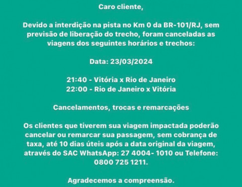 A Polícia Rodoviária Federal (PRF) também está no local para orientar os motoristas. A empresa de ônibus Águia Branca, que faz o trajeto entre as cidades do RJ e do ES, comunicou nesta noite que precisou cancelar viagens entre os dois estados por conta da interdição. O horário de 21h40, que era de Vitória para o Rio, foi cancelada. O horário de 22h do Rio para Vitória também. De acordo com a empresa, os clientes podem cancelar ou remarcar as viagens sem cobrança de taxa.