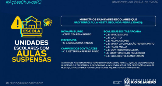 O Governo do Estado do Rio de Janeiro, por meio da Secretaria de Estado de Educação (Seeduc-RJ) informa que, ao todo, 11 escolas não conseguirão retornar às aulas, nesta segunda-feira (25), devido às fortes chuvas que atingem o estado desde a sexta-feira (22). Do total, oito unidades são de Bom Jesus do Itabapaona, uma de Itaperuna e outra de Campos. A medida foi tomada para garantir a segurança de alunos e servidores nas regiões mais afetadas e buscar o restabelecimento das atividades pedagógicas.