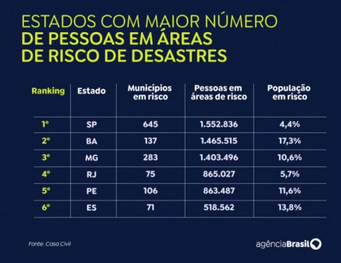 Com os novos dados, sistematizados até 2022, os estados com a maior proporção da população em áreas de risco são Bahia (17,3%), Espírito Santo (13,8%), Pernambuco (11,6%), Minas Gerais (10,6%) e Acre (9,7%). Já as unidades da federação com a população mais protegida contra desastres são Distrito Federal (0,1%); Goiás (0,2%), Mato Grosso (0,3%) e Paraná (1%).