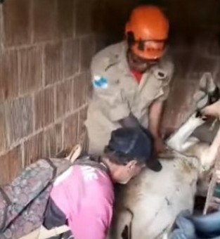 Vaca cai do telhado de uma casa e é resgatada pelos bombeiros em Cordeiro