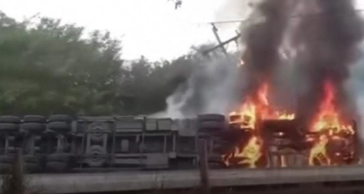 Uma carreta com uma carga de papel tombou e pegou fogo na BR 101, na altura de Ibitioca, em Campos. O acidente aconteceu na tarde desta terça-feira (2). O Corpo de Bombeiros foi acionado e atuou no local para conter as chamas e socorrer as vítimas. O motorista da carreta não sofreu ferimenrtos graves. O veículo transportava cerca de 30 toneladas de papel. As pistas chegaram a ficar interditadas nos dois sentidos da via, no km 82.