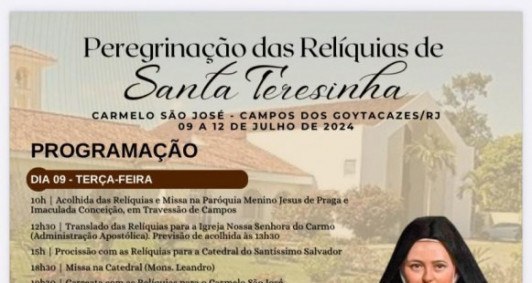 A Diocese de Campos recebeu a peregrinação das relíquias de Santa Teresinha, nesta terça-feira (9). Dezenas de fiéis participaram do cortejo e lotaram a Igreja São Salvador, no Centro da cidade. O relicário leva o fêmur e os ossos do pé da Santa. Essas relíquias expressam a dimensão missionária da Santa que, em vida, manteve sempre o desejo de caminhar pelo mundo para anunciar a Jesus Cristo.