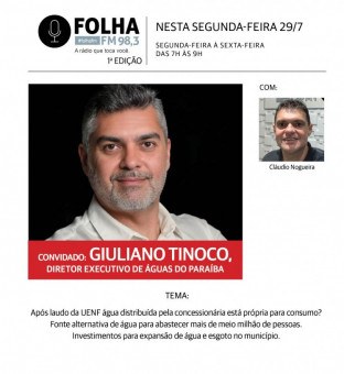 No programa, que será apresentado por Cláudio Nogueira, Giuliano vai falar e responder questões sobre o tema, como fontes alternativas de água para abastecer mais de meio milhão de pessoas, além do investimento da concessionária para a expansão de água e esgoto no município.