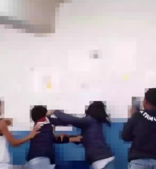 Na imagem é possível notar, duas alunas brigando dentro da instituição de ensino. Envolta da confusão, outros estudantes incentivam a briga, proferindo palavras grosseiras e fazendo gestos para que elas continuem com a violência.
