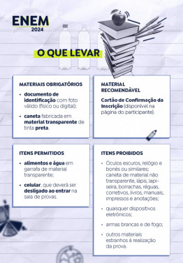 Além do documento de identificação, outro item obrigatório para fazer a prova é uma caneta esferográfica de tinta preta, fabricada em material transparente. Qualquer outro material deve ser guardado em um envelope porta-objetos, lacrado e colocado abaixo da carteira de cada participante. Lanches são permitidos, mas poderão ser vistoriados pelos fiscais de sala.