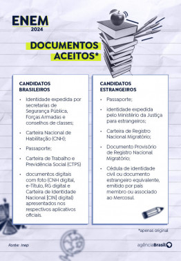 A partir desta edição do Enem, não serão aceitos documentos de identificação descritos abaixo, nem boletim de ocorrência de órgãos policiais, em caso de perda ou roubo de documentos de identificação.
