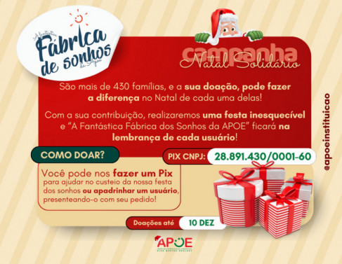 “Todo ano a gente faz uma festa de natal para os nossos usuários e suas famílias que muitas vezes possuem na Apoe, a única experiência de natal. Esse ano resolvemos fazer a festa montando um grande parque de diversões na instituição, por meio do aluguel de brinquedos infláveis, lanches e distribuição de brinquedos. Esperamos levar aos nossos usuários uma experiência única com muita diversão. Vamos apresentar nesse dia a nossa cantata de Natal, com nossos usuários tocando na banda fanfarra”, contou a presidente Pryscila Marins.