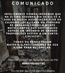 Em Campos, um curto circuito na última semana destruiu a Associação Flor do Cajueiro, que atende 75 famílias com doações de cestas básicas, brinquedos, roupas e almoço em datas especiais.