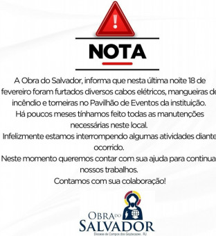 A sede da Obra do Salvador, localizada no Parque Leopoldina, em Campos, foi invadida e furtada na noite dessa terça-feira (18). De acordo com o comunicado da instituição, foram furtados diversos cabos elétricos, mangueiras de incêndio e torneiras.