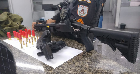 De acordo com a PM, uma denúncia apontou tiros no local. Os suspeitos foram abordados e durante revista foram apreendidos uma pistola calibre 9 mm com 13 munições, que estava escondida no porta-luvas do veículo em que estavam, além de uma espingarda calibre 12 com 10 cartuchos intactos localizada no banco traseiro. As armas apreendidas possuem numeração, e o filho afirmou possuir registros de ambas, mas não apresentou qualquer documentação no momento da abordagem.