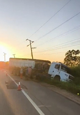 A causa do acidente ainda não foi divulgada. O trânsito no local segue sem transtornos, com veículos de uma das faixas precisando desviar apenas na área do acidente em que o caminhão está atravessado.