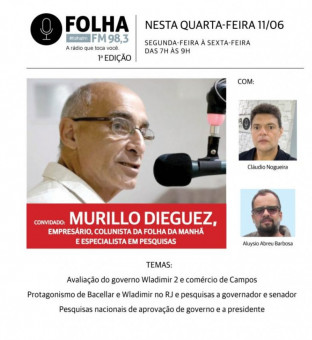 Empresário, colunista da Folha da Manhã e especialista em pesquisas, Murillo Dieguez foi o convidado do Folha no Ar nesta quarta (11). Ele avaliou os seis primeiros meses do governo Wladimir 2 e a atividade comercial em Campos.