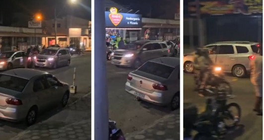 Nas imagens é possível ver que ocupantes de dois carros discutiam, quando o condutor de uma Spin, que estava parada no meio da rua, avançou em direção aos ocupantes do outro carro, que estava parado em frente a hamburgueria. Um homem foi atingido e, com o impacto, foi jogado ao chão.