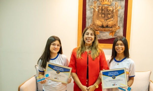 Com a realização da posse simbólica realizada nesta terça, as estudantes do ensino fundamental puderam acompanhar de perto parte da rotina de trabalho da prefeita Carla Caputi, além de serem homenageadas com placas personalizadas e poderem sentar na cadeira da chefe do Executivo, onde “despacharam”, inclusive com o secretário municipal de Educação, Daniel Damasceno.