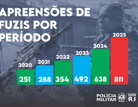 Um levantamento realizado pela área de inteligência da Secretaria de Estado de Polícia Militar do Rio de Janeiro demonstra uma curiosa e aparentemente contraditória constatação. Num período de seis anos - de 2020 a 2025 -, houve um aumento expressivo de 223% do número de fuzis apreendidos por policiais militares no estado, enquanto, no mesmo intervalo de tempo, os confrontos armados com criminosos registraram uma redução de 31,7%. Em 2025, foram apreendidos 811 fuzis, um recorde absoluto na série histórica de apreensões dessas armas por policiais militares.