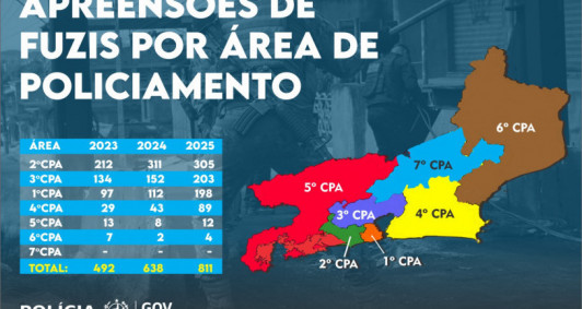 A maior parte dessas armas de guerra continuam concentradas nas regiões sob responsabilidade dos Comandos de Policiamento de Área da Zona Oeste e parte da Zona Norte da capital (2º CPA) e da Baixada Fluminense (3º CPA). Em 2025, houve um aumento significativo de fuzis apreendidos na região do 1º CPA em função da megaoperação de 28 de outubro nos complexos do Alemão e da Penha, quando foram recolhidas 93 dessas armas de guerra.