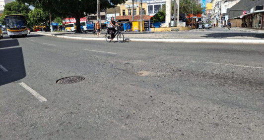 Buraco gera transtornos próximo ao ponto de ônibus do Centro de Campos
