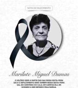 A empresária Marilute Miguel Dumas faleceu, aos 83 anos, no Hospital da Unimed, em Campos, onde estava internada. A informação foi confirmada por familiares na manhã desta sexta-feira (24). O velório acontece nesta manhã, em uma capela da Santa Casa de Misericórdia e o sepultamento acontecerá às 16h30, no Cemitério do Caju.