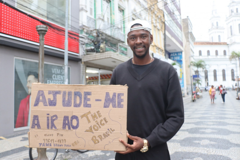 "Ajude-me a ir ao ‘The Voice Brasil’”. É improvável que alguém passe pelo Boulevard Francisco de Paula, no Centro de Campos, nas tardes de segunda a sexta-feira, e não note essa frase escrita em um pedaço de papelão. O cartaz improvisado fica ao lado de um jovem que, na correria do dia a dia, provavelmente não chamaria a atenção se não cantasse em alto e bom som, com uma bela voz. Trata-se do campista James Bruno Paulo, que, aos 24 anos, tem o popular Calçadão como seu local de trabalho, arrecadando doações para sobreviver e lutar pelo sonho de ser um cantor profissional.