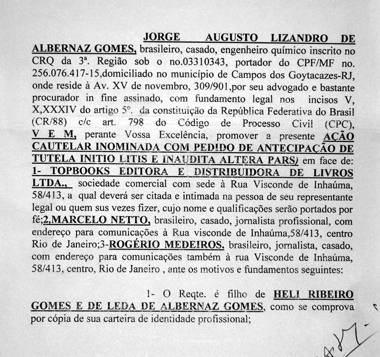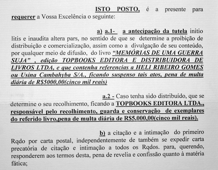 A família do falecido industrial Heli Ribeiro Gomes, representada pelo advogado Carlos Alberto Senra, entrou com Medida Cautelar com pedido Antecipação de Tutela contra a Editora Topbooks, pedindo a proibição de circulação e a busca e apreensão de todos os exemplares do livro “Memórias de Uma Guerra Suja”, que faz graves acusações ao industrial e ex-vice governador, como a de ter permitido a utilização do forno da Usina Cambahyba para incinerar corpos de militantes o período da ditadura.