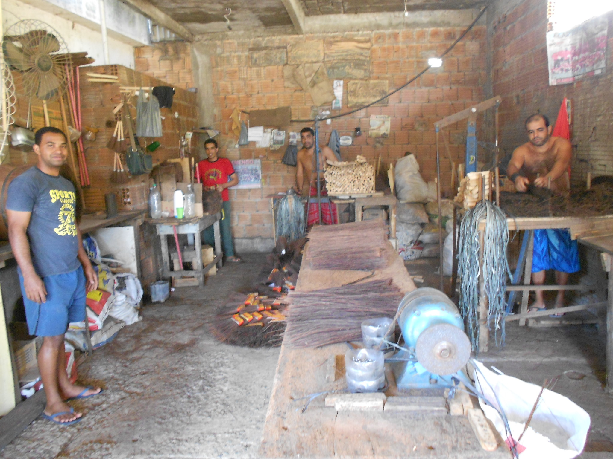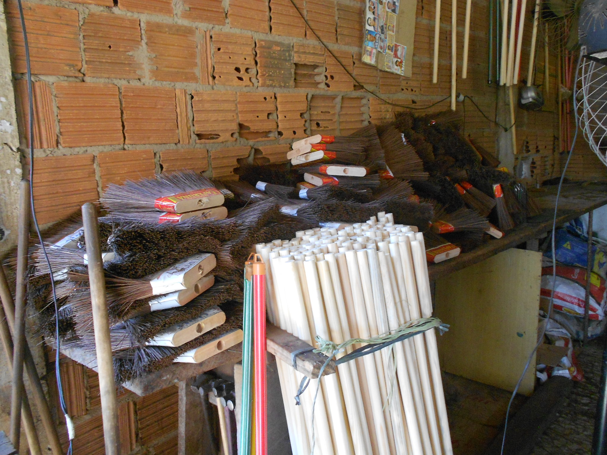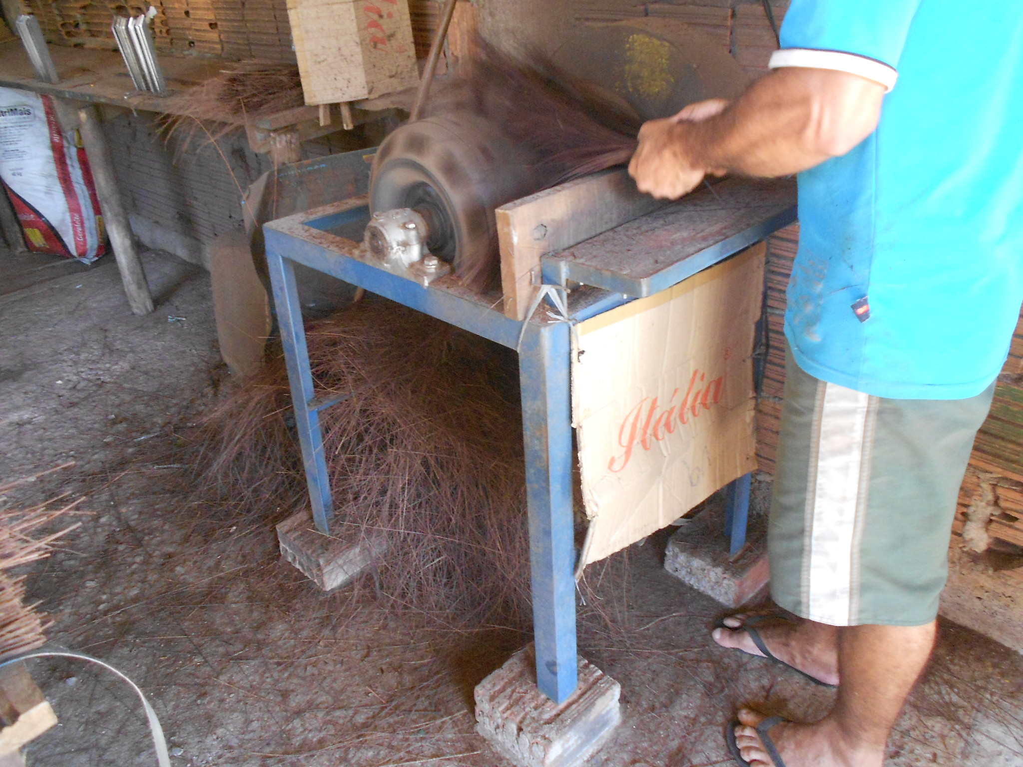 A piaçava vem da Bahia. Chega amarrada em rolos; abertos são, separados em feixes e, com o auxílio de um artefato, excluídas as menores. As maiores assim selecionadas, ficam em molhos nas mãos do operário que com destreza realiza a operação. Esse é só um dos passos para dar forma final à dura palha, transformada ao fim em vassoura: “Vassoura Itaperuna”. Seu Itamar é o dono da fabriqueta, estava na rua vendendo o produto. Da fabricação do utensílio, sobrevivem sete homens e respectivas famílias, não sabemos quantas bocas dali tiram seu sustento.