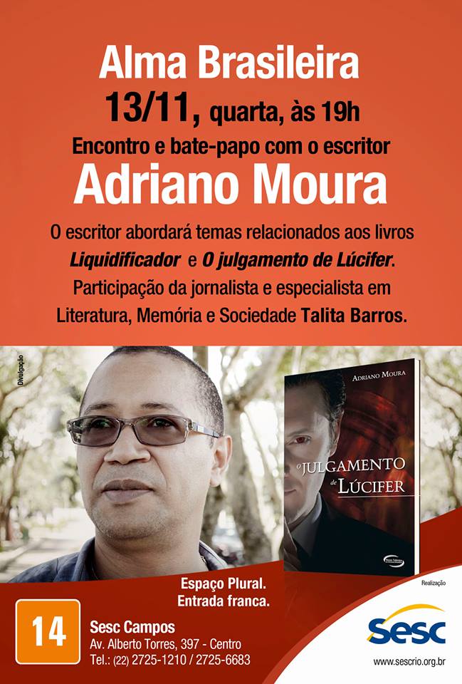 Estaremos, a tempo e hora, de olho na tela, assistindo Cida falar dos bolos de sonho e desejos de futuro, o link é esse aqui. É hoje, quarta-feira, às 19h, no Sesc Campos, Av. Alberto Torres, 397. Garantia de boa conversa com Adriano Moura. O livro " O Julgamento de Lúcifer" já se encontra à venda em Campos na Livraria Honey Book, Av. Pelinca. Lançado recente no Rio de Janeiro, teve esgotada sua primeira edição. Vai pegar fogo!