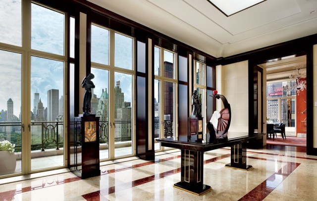 No topo de um edifício de Midtown projetado por Robert Stern, encontra-se o apartamento de 600 m² decorado pela designer de interiores Mica Ertegün. Nada menos do que 19 portas envidraçadas dão acesso aos vários terraços que circundam a ala social e a cobertura e descortinam vistas impressionantes para o Central Park. No interior, a arte está por toda a parte. Pinturas do norte-americano Thomas Hart Benton colorem as salas de estar e de jantar.