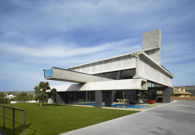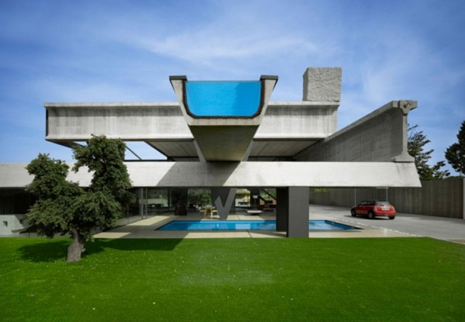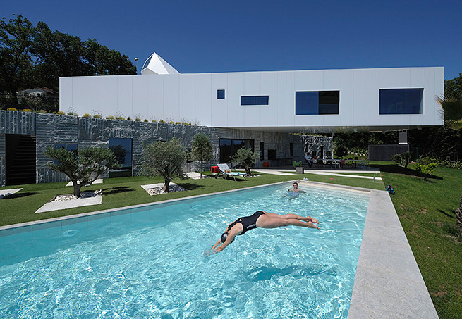 Espanha Não balança, nem cai, mas à primeira vista esta piscina localizada no alto da casa, em Madri, parece estar prestes a tombar, como uma gangorra. A ideia de instabilidade é intencional, de acordo com os arquitetos espanhóis do escritório Ensamble Studio. O desenvolvimento do processo de engenharia levou um ano para ficar pronto. A demora foi compensada pela construção, que foi finalizada em apenas uma semana. Concreto, aço e vidro são os materiais predominantes no projeto, que tem uma área de pouco mais de 1.300 m².