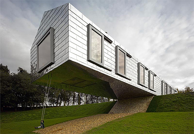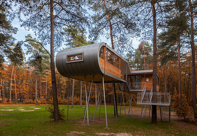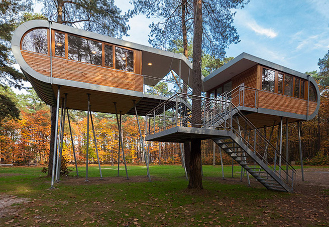 Bélgica Dezenove estacas de aço inoxidável fixadas à terra em ângulos diferentes são responsáveis por deixar esta casa, nas florestas de Hechtel-Eksel, na Bélgica, de pé. Construída por um escritório alemão de arquitetura chamado Baumraum, o imóvel tem dois níveis, suspensos a alturas diferentes – 5,5 e 6,5 metros de altura - e serve como abrigo para as reuniões de uma empresa local.