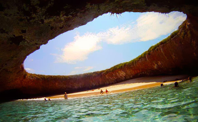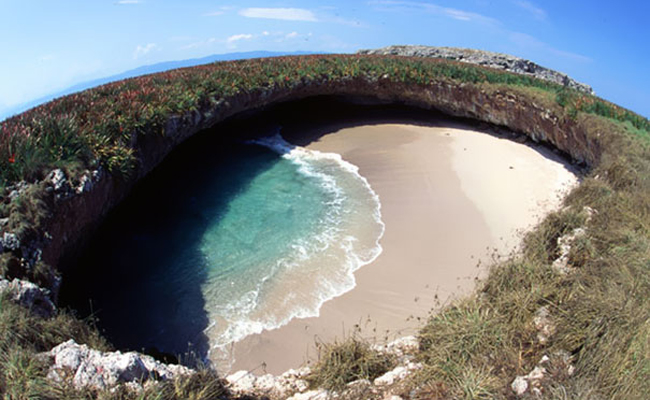 Quem passa de barco nem imagina que uma pequena ilha rochosa esconde em seu interior um verdadeiro paraíso marinho. Uma praia secreta foi formada em um buraco no meio da pedra. A atração-surpresa fica nas Ilhas Marietas, em Puerto Vallarta, no México. O acesso só é possível de barco, por um túnel embaixo das rochas.