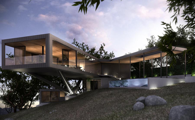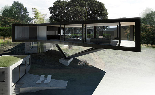 Estados Unidos Construir uma casa em vários níveis, acompanhando o declive da montanha, ou igualar o terreno? A equipe do Craig Steely Architecture fez melhor: o living do imóvel, que fica em Napa, Califórnia, de mais de 2 mil m² flutua a alguns metros acima do chão, sustentado por pilares de concreto. Assim, foi possível manter a estrutura do lugar, as árvores e as pedras ao redor. Os dois quartos estão localizados na área central da casa, próximos ao chão. Do lado de fora, há uma área de lazer com piscina e uma edícula.