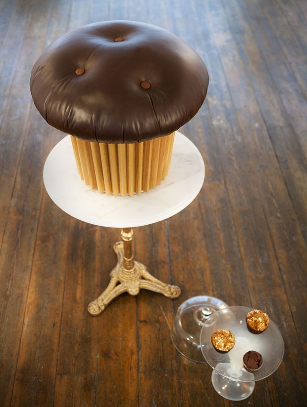 A peça do designer italiano Matteo Bianchi – diretor criativo e fundador da Daruma Design, com sede em Londres – remete aos clássicos bolinhos de chocolate, mas com assento revestido de estofado de couro e pelúcia. A cobertura, que parece de chocolate, é removível, revelando um espaço de armazenamento adicional, ideal para guardar objetos. É feito à mão com materiais italianos, como couro, botões e base de madeira.