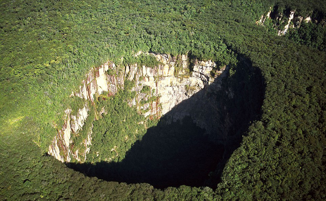 Este enorme precipício, raro em florestas tropicais como a Amazônia, é uma depressão natural da superfície da Terra