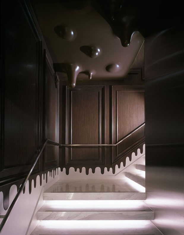 Loja da Godiva no Japão, projeto do Wonderwall Uma loja de chocolates finos, de dois andares e toda decorada com o próprio, mas de mentirinha. Assim é a Godiva em Harajuku, em Tóquio, Japão. O estúdio de design Wonderwall projetou paredes e tetos que remetem a pingos de chocolate derretido, combinando com móveis de linhas simples e luminárias de design. As paredes do térreo são pintadas de branco em sua parte inferior, contrastando com a cor chocolate, que parece escorrer do teto do segundo andar, onde há um café.